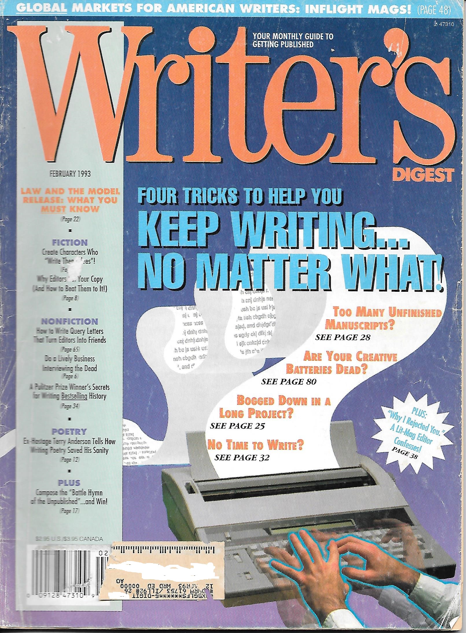 My first publication (in a magazine with some legit circulation) was when I got honorable mention in a Writer’s Digest limerick contest.