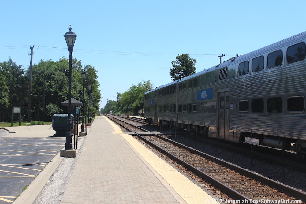 The suburbs recede, one at a time: Schaumburg, Roselle, Itasca, Franklin Park.